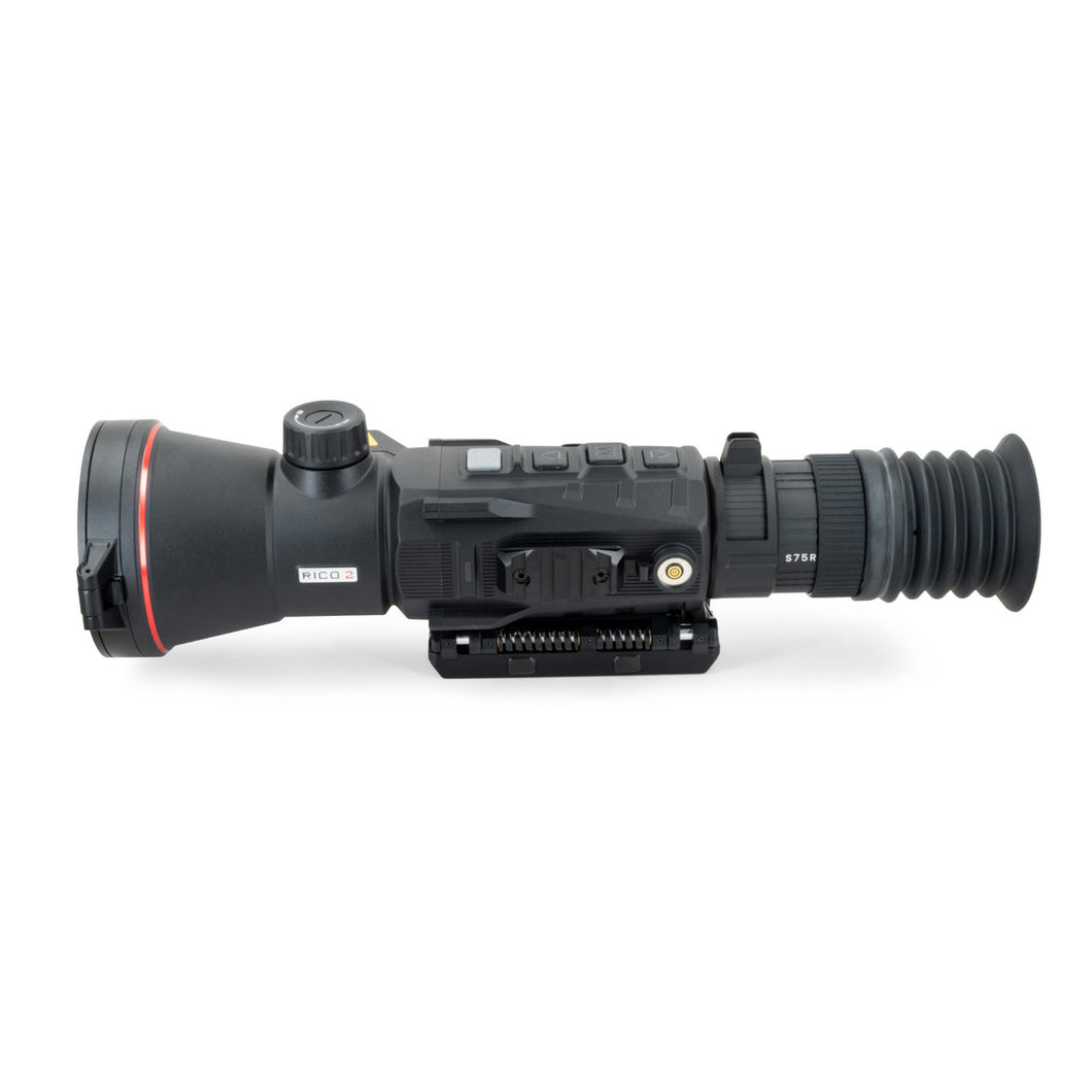 The RICO 2 (Rugged Infrared Compact Optic) delivers cutting-edge thermal performance with advanced imaging technology and precision-driven features. Available in four models—S75R (1280×1024, 75 mm), H75R (640×512, 75 mm), H50R(640×512, 50 mm), and L42R (384×288, 42 mm)—each boasts a ≤15 or ≤18 mK NETD rating for exceptional thermal sensitivity. A high-resolution 2560×2560 round AMOLED display provides a comfortable and immersive viewing experience, while the smooth digital zoom control ensures seamless, intuitive operation. The integrated 1,200-yard laser rangefinder pairs with an advanced ballistic calculator—just input bullet velocity and ballistic coefficient, and the system automatically adjusts for drop based on target distance. Additional features include a quick-detach mounting system, spare battery, magnetic charging port, recoil-activated video, and picture-in-picture mode. Built for serious shooters, the RICO 2 combines rugged durability with premium performance.