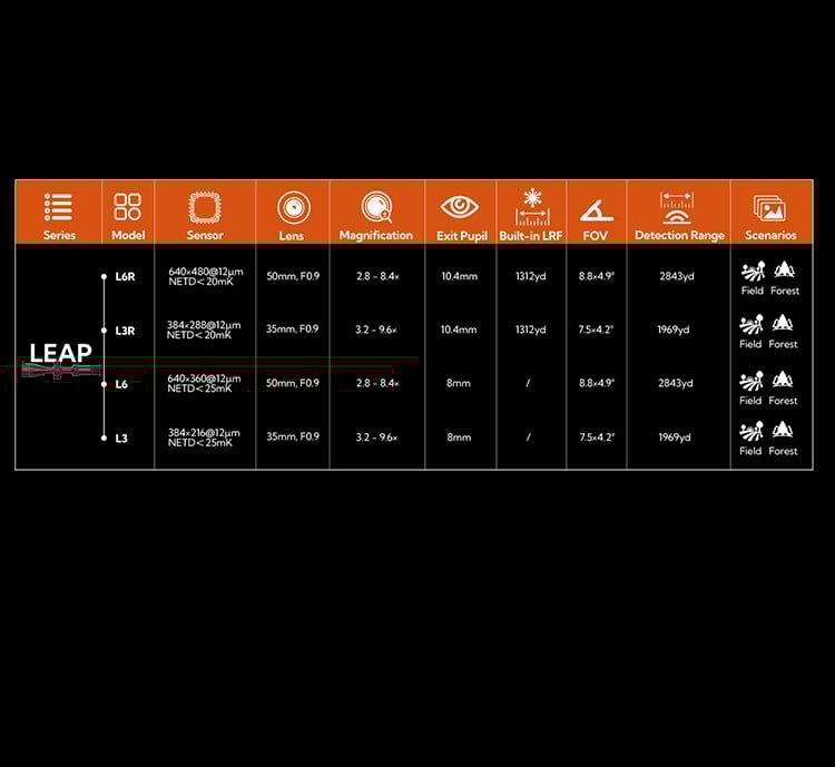 The LEAP series is the ultimate hunting companion. The rifle scopes’ high-sensitivity infrared detector and advanced thermal imaging technology ensure clear visibility in harsh conditions like rain, snow,fog, or darkness. It features a 30mm diameter standard tube, which makes for easy mounting, and a wide-range of capabilities including photography, video, automatic shooting capture, optical & electric zoom, Picture-in-Picture (PIP), many other reticle options and now, its even got a built-in rangefinder. Gone are the days that require extra equipment, the LEAP L3R & L6R are your one stop shop for a successful hunting season.